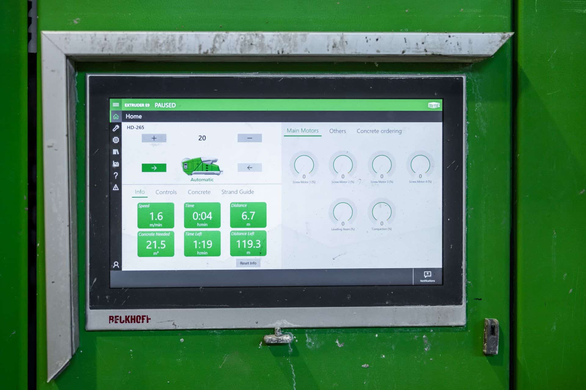 The Extruder E9 features an easy-to-use visual user interface. All casting parameters can be saved or recalled automatically, and several sets of casting parameters can be saved for each nozzle module. In addition to using the Metric system, it is easy to operate with the Imperial system as well. The machine is also equipped with concrete ordering automation.